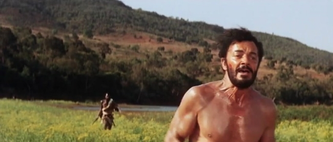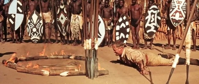 Wilde plays a safari guide anticipating retirement after one last expedition. When his elephant-hunting client (Gert van den Bergh) refuses, despite his warnings, to comply with a Zulu warrior’s (Ken Gampu) demand for tribute, the expedition camp is promptly attacked. Due to the perceived “insult” the hunters are brutally slain. This leaves only the 54-year-old Wilde who is stripped naked and chased into the bush, where he must elude wild animals and his vengeful pursuers and attempt to return to “civilisation”. Because the Nguni dialect is not subtitled, we, like the hero, fail to understand all the considerations governing this “trial by ordeal”. Wilde’s is in mortal danger, but because he had argued in favour of paying tribute, the tribesmen afford him the honour of proving himself their equal as a warrior.
