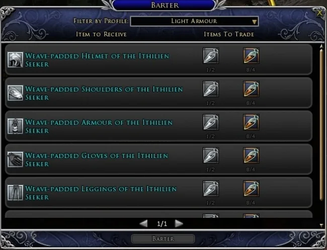 So, I spent some time recently gathering the various plants in North Ithilien that yield Phials of Extract; the barter items need for the gear set. However, because I’ve been focused on other in-game tasks I didn’t really consider how long it would take to meet the criteria to obtain the full set of Light Weave Padded Armour for my Lore-master. Today I sat down with a pen and paper and did the math(s). A full set comprises of 6 pieces (no cloak). Each item requires 2 Phials of Sapphire Extract and 4 Phials of Amber. So, in total to purchase this set you need 12 Phials of Sapphire and 24 Phials of Amber. To obtain Phials of Sapphire and Amber Extract you have to combine lesser extracts such as Umber, Verdant and Crimson, which come from picking plants in North Ithilien. Sapphire requires 250 lesser extracts and Amber 125. So, to summarise here is a breakdown of the numbers needed for a full set of armour, be it light, medium or heavy: