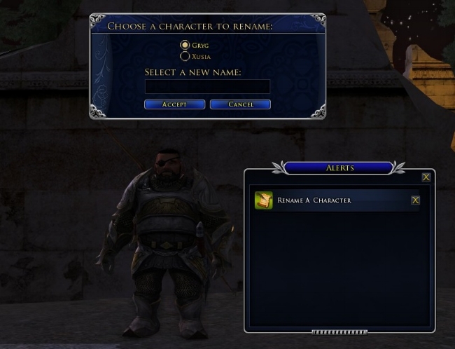 Earlier today, I found that I had earned sufficient LOTRO points that I could go ahead and buy the rename token. Here’s a useful tip. As soon as you purchase the token, it immediately opens a rename window. I was expecting an item in my bag that was manually used. However regardless of this somewhat peremptory message, you do not have to use the rename immediately, especially if you are still considering names. You can cancel the window and access it again at a more convenient time from your Alerts window. So I logged out of the game, to start drafting a new list of prospective names. I also logged back in to make sure nothing screwed up, which it hasn’t. I like to be thorough.