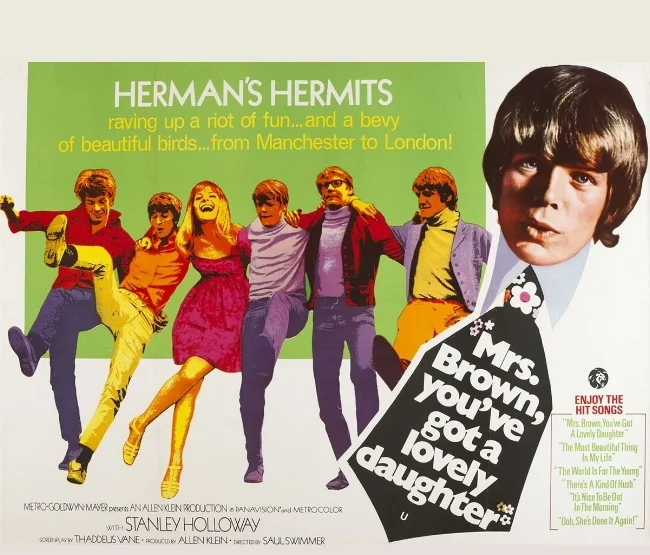 I was channel surfing a while back when I stumbled across Mrs. Brown, You've Got a Lovely Daughter, a feature film starring none other than Herman's Hermits! Now I was aware that after the success of the Fab Four's A Hard Day’s Night and Help, several popular bands tried to follow in their wake. The Dave Clark Five made Catch Us If You Can (directed by John Boorman) and there were numerous vehicles for Cliff Richard. But apparently, Herman's Hermits were signed to MGM records in the US and it was standard marketing practice to make at least one feature film vehicle for their bestselling artists. Apparently, this included Hank Williams, Connie Francis and Roy Orbison although I’m not familiar with the movies they made. Hence there’s nothing really that unusual about this film’s existence.