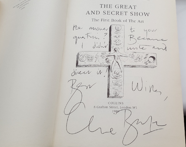 When I next met with Paul, I was presented with a first edition copy of The Great and Secret Show. To my surprise, Paul did not convey to me verbally, the reply Clive Barker had made to my probing enquiry or regale me with a lengthy anecdote about his experience. He simply opened the book, presenting me with a hand-written inscription from the author himself. I remember being utterly stunned that Clive Barker himself had not only written a personal message but had addressed my point head on, in a succinct and candid fashion. To this very day, I’m still impressed that he took the time to do this. I think it speaks volumes about the man and his approach to fans and life.