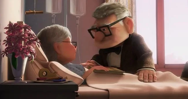 Up (2009). The opening scenes of Up are a beautiful distillation of the life of Carl Fredricksen (Ed Asner), the movies main character. Comprising of a montage, we are shown him meeting his childhood sweatheart Ellie and there subsequent marriage. The narrative then explores the major events of their life together. The couple are not blessed with children and also have to sideline their ambitions to travel the world, due to the realities of work and married life. Ellie grows sick in her autumn years and dies leaving Carl a widower. The sequence plays out wordlessly against a winsome and understated score by Michel Giacchino. The emotional depth and craftsmanship apparent in these scenes are of a quality seldom seen in modern film making. They validate the skills of Pixar Animation Studios and the medium of animation.