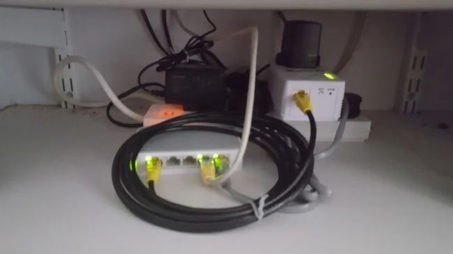 Our TV is mounted on the chimney breast in our lounge and we have a sofa in front of it about 8 feet away. The DVR, Blu-ray and media player are on shelves in the fireplace below. Although practical this is not necessarily convenient from a technological perspective. The roof aerial is in the loft above the lounge so the cabling comes down the chimney. However, providing sufficient power outlets and internet access is a challenge. For safety and cosmetic reasons Mrs P is not keen on long ethernet cables, even if they’re neatly pinned to the skirting board. The wireless bridge solution works and the data transfer rate is sufficient but wifi is not always a reliable means of providing internet access. As and when we next move, a lot more thought will go into ensuring that there are enough electrical sockets and data ports exactly where they’re needed.