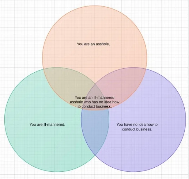 So it would appear that this joker wants to do some sort of business with me, but is reticent to stipulate the exact nature of which and furthermore wants me to waste my precious time contacting them to proceed further. The stupidity of the proposition beggars belief. They must be stupid, ill-mannered or utterly clueless about how to conduct business; or maybe all three? Perhaps a Venn diagram will help clarify the situation.