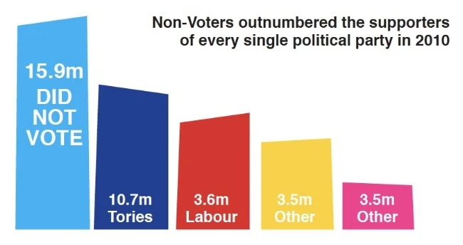 A third of registered voters in the UK do not vote in either Local or General Elections. Out of an electorate of approximately 46,200,000 that is 15,700,000. Yet despite this substantial group not participating, it is seldom covered or discussed in the media. It is usually just written off as “voter apathy”, implying that those who did not cast their ballot are feckless, lazy or stupid. Not only is this patently untrue, not voting has major consequences. If this group of people were engaged and voted in the upcoming general election, then it would have a tangible impact upon the results. By not voting you are effectively giving the next UK government carte blanche to ignore your interests and pursue their own agenda. As Leonardo da Vinci famously said, "Nothing strengthens authority so much as silence".