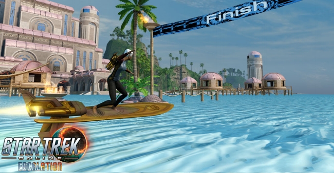 What I especially like about the Summer event in STO is it’s setting on the vacation resort Risa. Holidays are typically about, sun, sea and surf and Risa has that in spades. You can also dress accordingly with a variety of beachwear and other cosmetic items. The use of Floaters and Powerboards in several events is great fun. The addition of the Biathlon this year combines both in a single race. The transition from one mode of transport to the other can be quite challenging and there are still the odd bug to be worked out. I like the fact that despite being a “race” the winner is determined by the claiming of a flag. It helps level the playing field for those with slower internet connections. Half the fun is listening to players carp in chat about how they came first but overshot the flag and lost their placing.